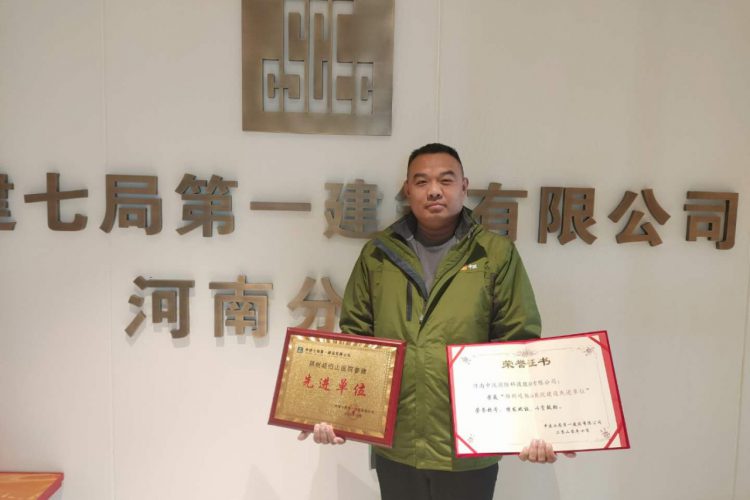 在参援郑州岐伯山医院的时候,正是疫情严峻之时,中沃安装工与一线业务人员同中建七局2000多名工人在项目上交叉施工,连夜不休,圆满完成了郑州岐伯山医院的援建工作,受到中建七局表彰。中沃门业郑州基地营销总监徐金岗,代表公司前往中建七局第一建筑有限公司领取表彰。